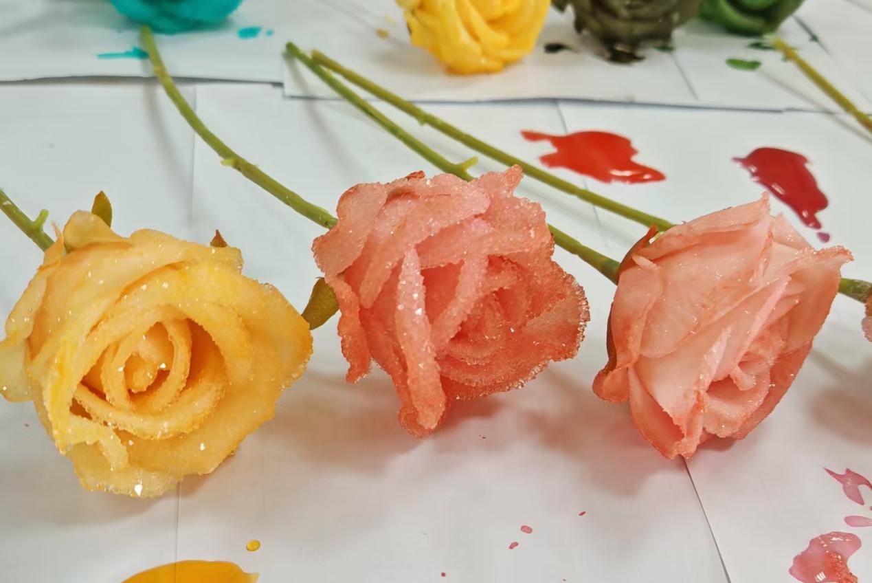 更引人注目的是教师方阵的创意展示——教师们手捧在实验室中自主结晶培育出的彩色晶体玫瑰,绚丽的蓝、紫、金色结晶在阳光下熠熠生辉。这些凝聚学科智慧的“永不凋谢的玫瑰”,既象征环化人对科学之美的追求,也寄托着对运动员们绽放光彩的真挚祝福。