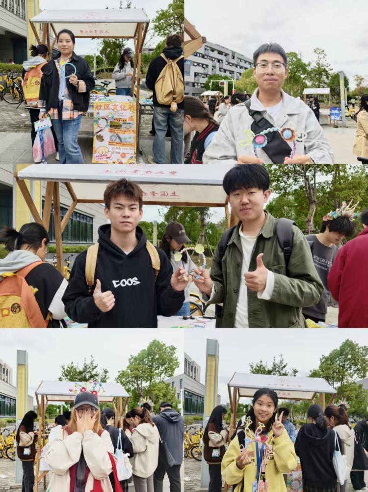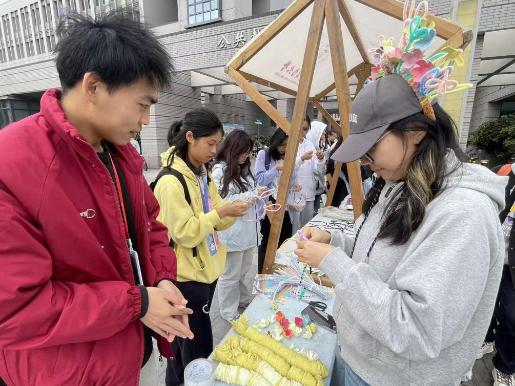 活动伊始,摊位便被闻讯而来的同学们层层围住。在负责同学的耐心指导下,大家迅速投入到“鸡蛋托簪花”的创作中。现场照片记录下了许多专注的瞬间:有的同学小心翼翼地用画笔为剪好的花瓣涂上心仪的色彩;有的同学则巧妙地用扭扭棒在发箍上缠绕、扭折,构建出独特的造型框架;还有三五成群的同学相互协作,讨论着如何将花朵粘贴得更加美观。不一会儿,一件件独一无二、充满巧思的环保发簪便在同学们的巧手中诞生,引来阵阵赞叹。许多完成作品的同学兴奋地戴着发簪在摊位旁的拍照点留念,脸上洋溢着开心的笑容。