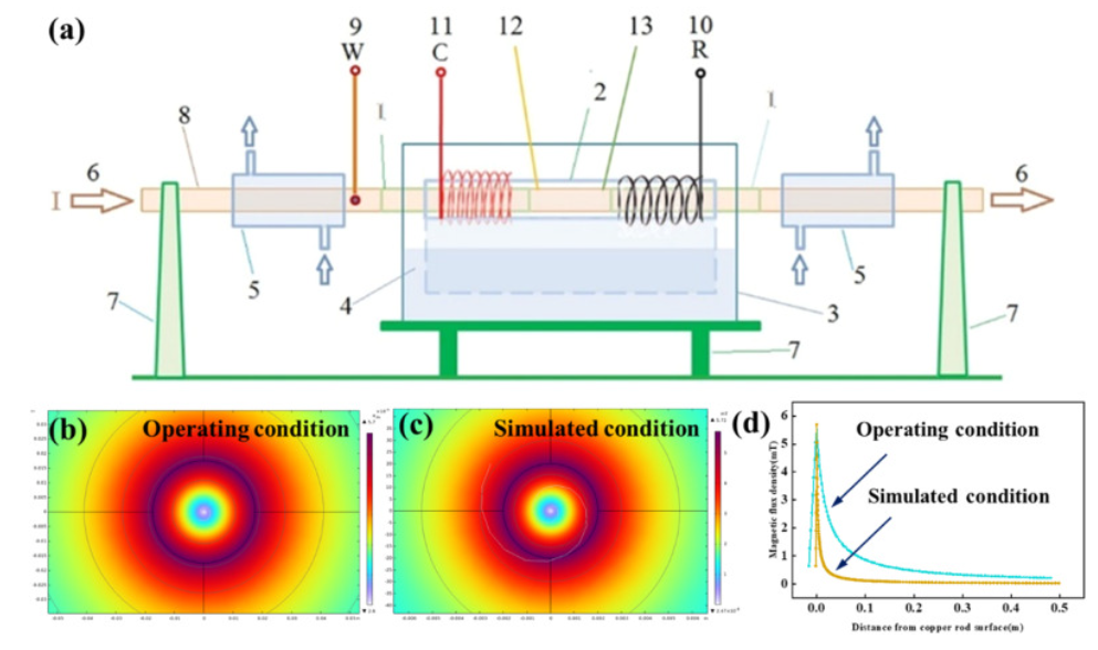 1 a)薄电解液层条件下铜导体电化学测量装置示意图;(b)工作条件、(c)模拟条件及(d)磁通密度比较下的铜导体表面磁场分布示意图。