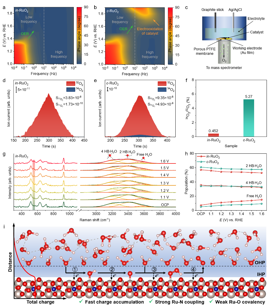 所制备的催化剂在10 mA cm-2电流密度下过电位仅为195 mV,且能稳定运行超过1000小时几乎无活性衰减。先进谱学表征与理论计算证实,氮掺杂形成的强Ru-N电子耦合与弱Ru-O共价性,在产生高价钌位点的同时抑制了其过氧化溶解及晶格氧析出,从根本上提升了催化剂的耐久性。深入的电化学分析与原位测试发现,高价钌位点的存在加速了催化剂表面的电荷积累,不仅促进了中间体化学键的断裂与形成,还优化了界面水的取向与组成,显著提升了反应动力学。以该催化剂为阳极的实际电解池仅需1.79 V即可达到1000 mA cm-2的工业级电流密度,并稳定运行至少300小时,展现出巨大的应用潜力。